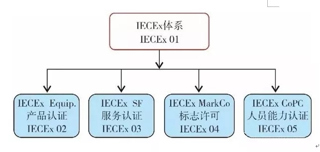 IECEx認證系統包括IECEx02產品認證,IECEx03服務認證,IECEx04標志許可,IECEx05人員能力認證見圖1。